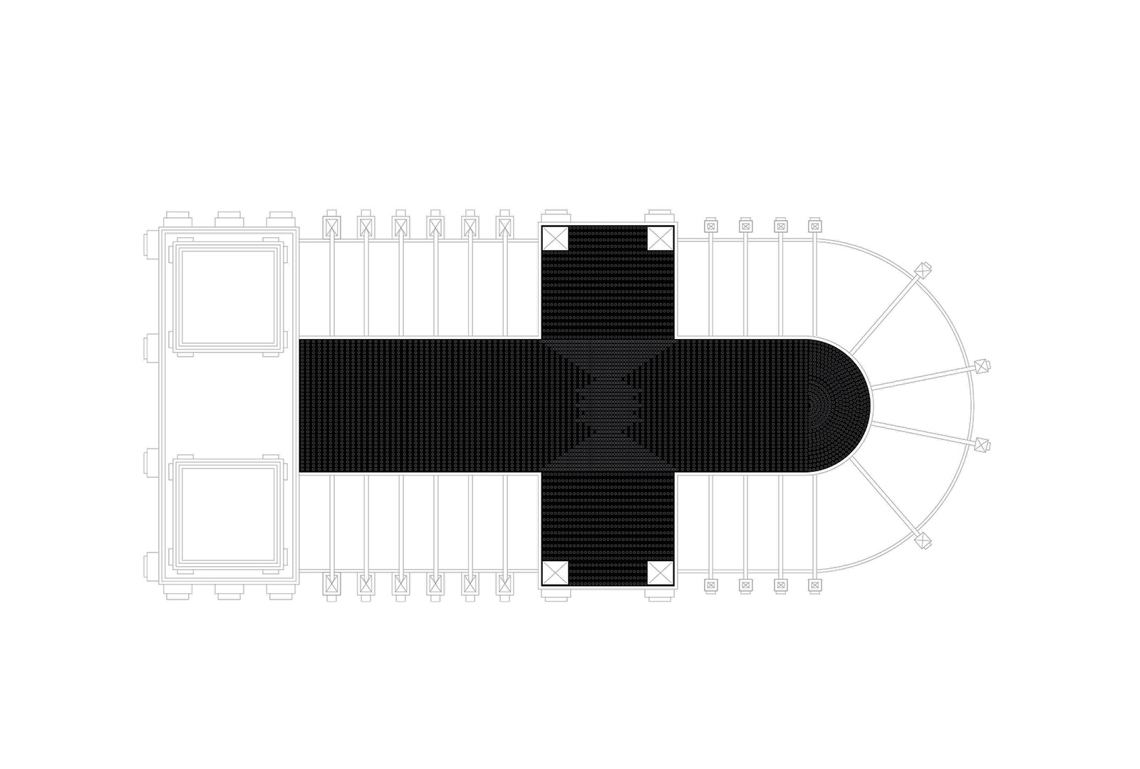 2. Sistema de re-construcción paramétrica: a partir de una serie de pequeños tubos/cilindros metálicos de diferentes alturas, equidistantes, copiando el gesto de la antigua cubierta y suspendidos sobre cables metálicos.